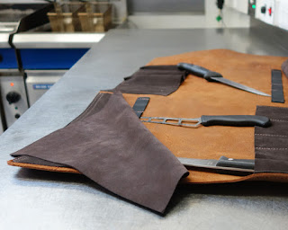 And then there was the chef’s knife-roll for Max. We love this piece – elasticated sections for each knife in his collection with protective suede covers all rolled up in a gorgeous thick chestnut hide with brass buckles. Yum! (and thanks go to chef Keith and his team at the Red Lion for allowing us to invade their kitchen just as they were prepping for the lunchtime service. These arty types don’t half pick their moments).