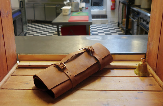 And then there was the chef’s knife-roll for Max. We love this piece – elasticated sections for each knife in his collection with protective suede covers all rolled up in a gorgeous thick chestnut hide with brass buckles. Yum! (and thanks go to chef Keith and his team at the Red Lion for allowing us to invade their kitchen just as they were prepping for the lunchtime service. These arty types don’t half pick their moments).